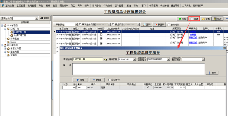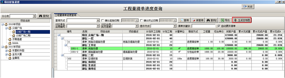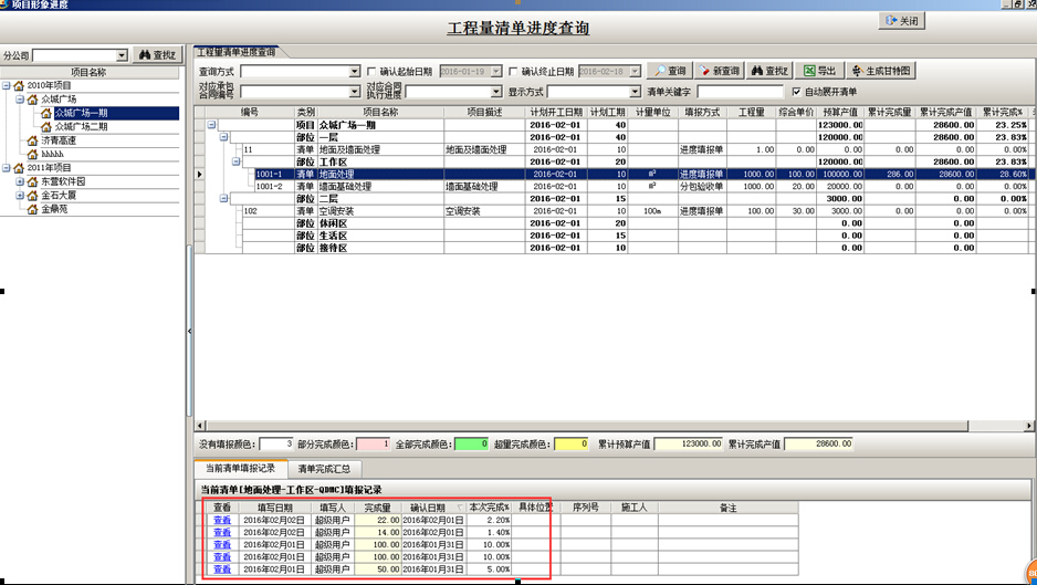 工程項目管理系統中進行項目進度查詢時,系統會根據項目部分以及工程量清單匯總項目進度。如圖: