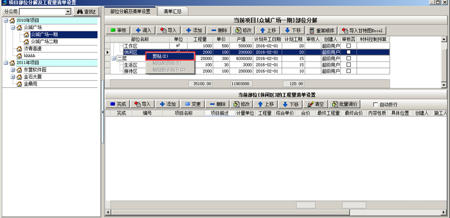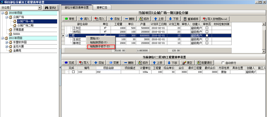工程項目管理系統中已維護好的項目部位可進行剪切粘貼的操作。“剪切”時選中要變動的部位,點擊鼠標右鍵選擇“剪切”,“粘貼”時選中項目部位,點擊鼠標右鍵,選擇“粘貼到頂級下”或“粘貼到子級下”,如圖: