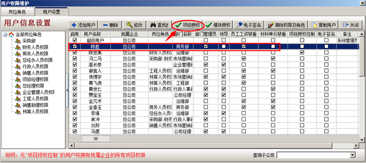然后陳勝的項目授權(quán),登錄超級用戶----系統(tǒng)維護----打開用戶管理權(quán)限設(shè)置,選中陳勝,設(shè)置項目授權(quán)