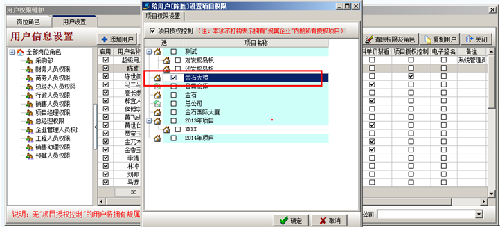 彈出設(shè)置項目授權(quán),以陳勝只有金石大樓這個項目的權(quán)限進行項目授權(quán)