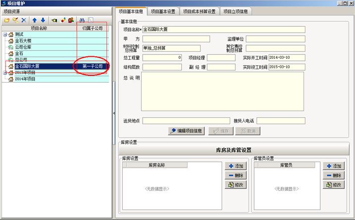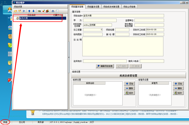 工程管理軟件中設(shè)置完成之后,重新登錄陳勝的賬戶,查看該員工的項目權(quán)限,項目維護中顯示的項目只有金石大樓這個項目