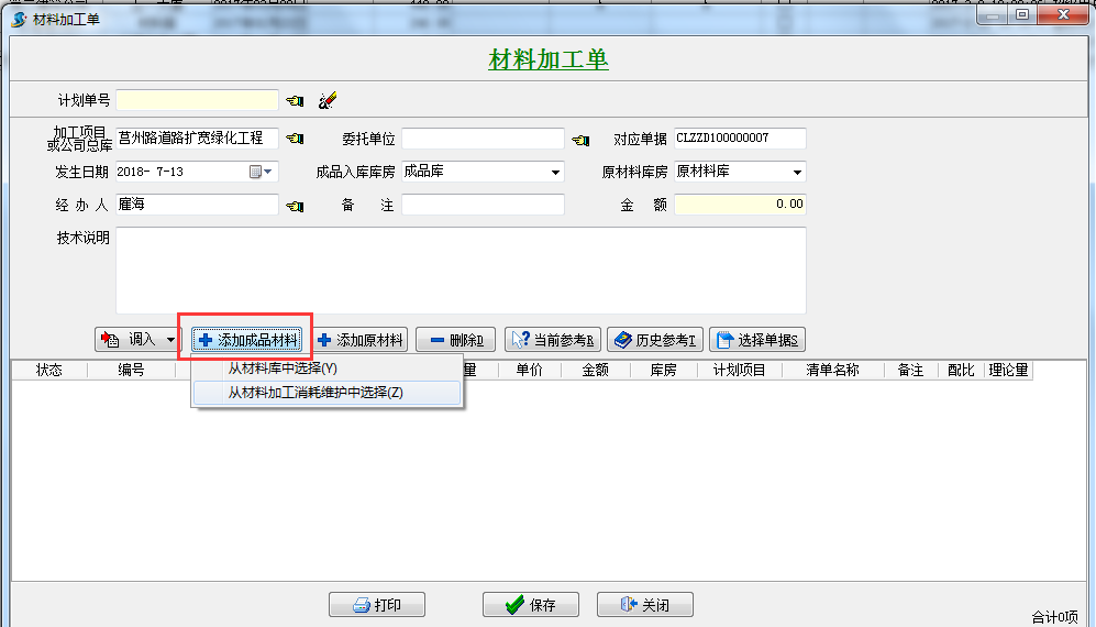 2.新建“材料加工單” 添加需要生產(chǎn)的成品材料,“從材料加工消耗維護(hù)中選擇”(上圖中做的材料加工消耗維護(hù))