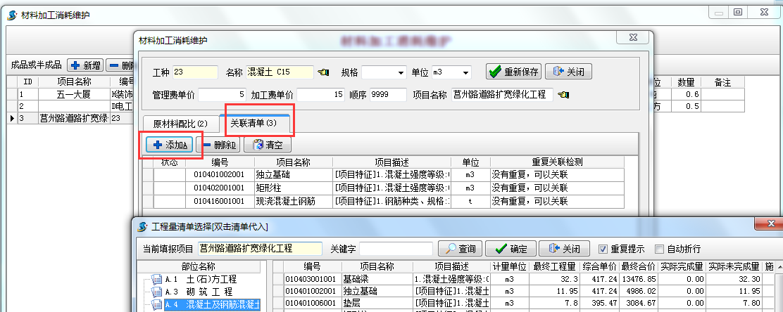 生產(chǎn)1立方混凝土用水泥0.6噸,石子 0.5立方,關(guān)聯(lián)清單 為3項(xiàng)表示該配比實(shí)用于以下3種清單 的混凝土。
