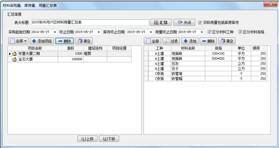 在工程項(xiàng)目管理系統(tǒng)中采購(gòu)庫(kù)存及用量匯總表可實(shí)現(xiàn)多個(gè)項(xiàng)目相同材料的采購(gòu)總量和用量的對(duì)比以及這這些項(xiàng)目采購(gòu)總量和用量的匯總。如下圖:設(shè)置兩個(gè)要對(duì)比的項(xiàng)目【金石大樓】、【東營(yíng)大廈二期】的查詢條件。