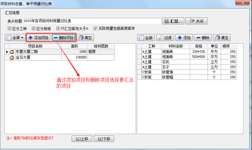 在工程項(xiàng)目管理系統(tǒng)中項(xiàng)目材料總量、單平方用量對(duì)比表可實(shí)現(xiàn)多個(gè)項(xiàng)目相同材料的總量、單平方用量的對(duì)比。如下圖:設(shè)置兩個(gè)要對(duì)比的項(xiàng)目【金石大廈】、【東營(yíng)大廈二期】的查詢條件。