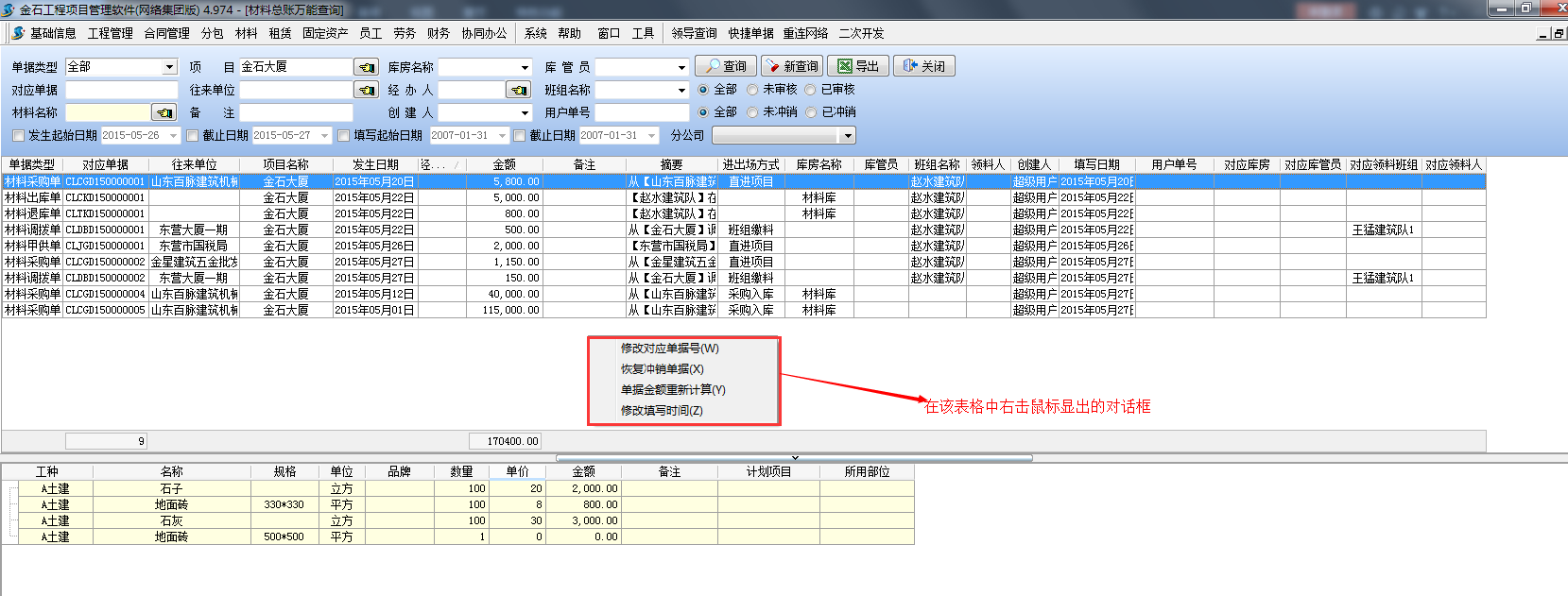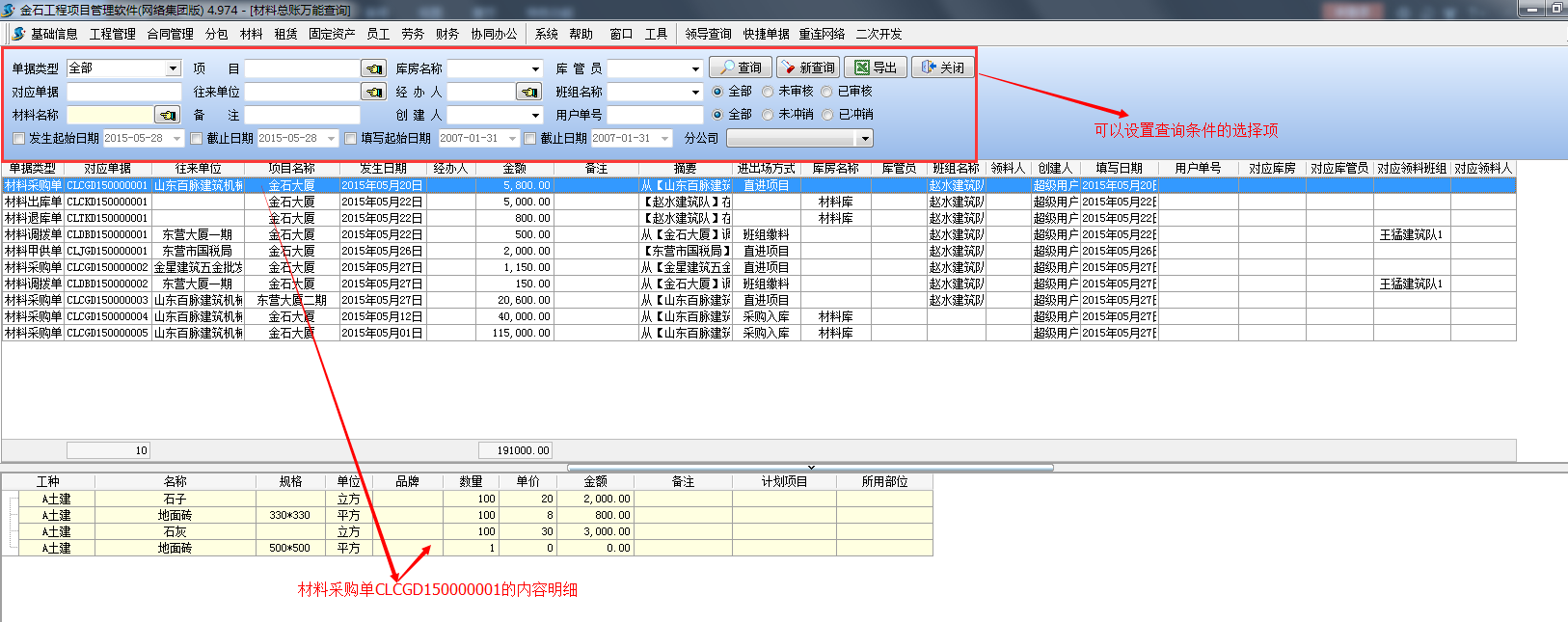 如下圖:查詢項(xiàng)目【金石大廈】所有材料采購(gòu)單的歷史明細(xì)。