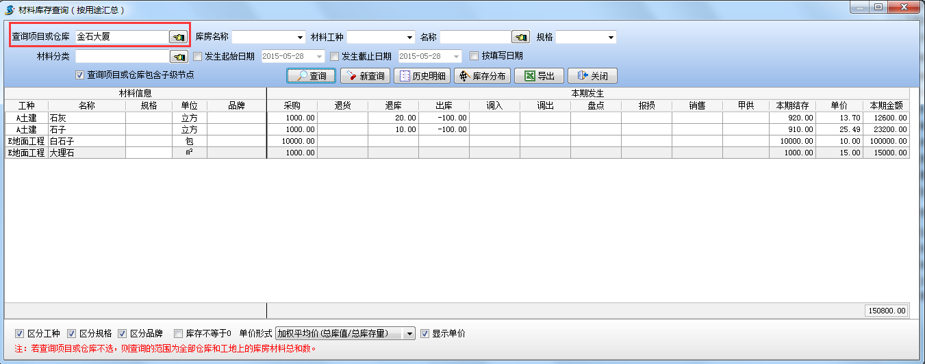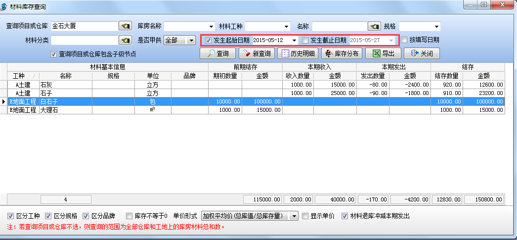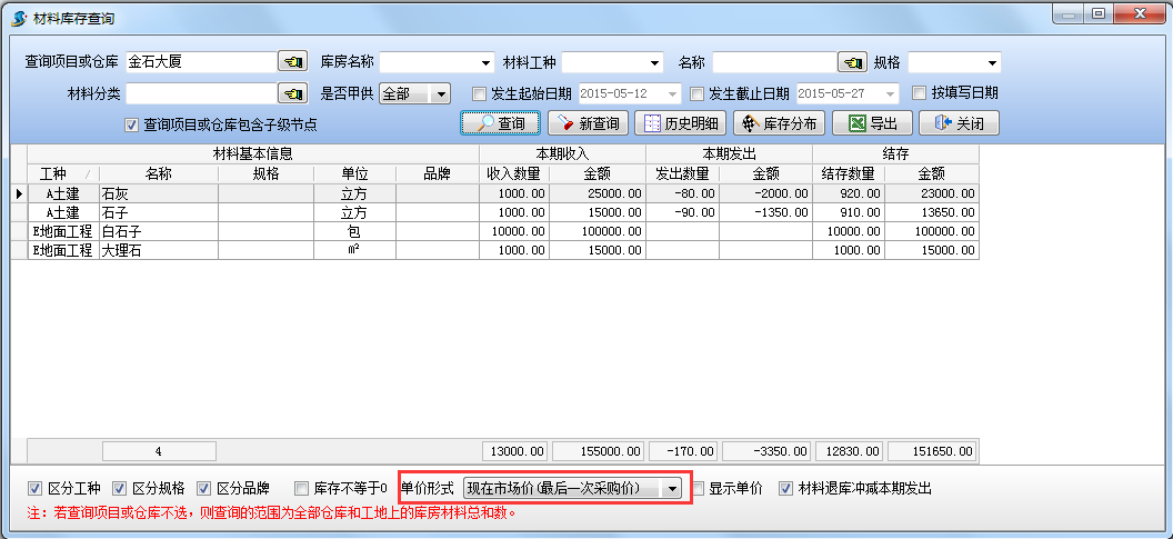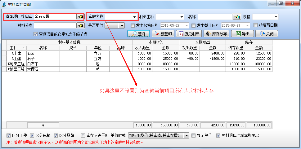 設(shè)置查詢項(xiàng)目為【金石大廈】,查詢結(jié)果如下圖:查詢當(dāng)前項(xiàng)目【金石大樓】(包括所有庫(kù)房)的材料庫(kù)存情況。