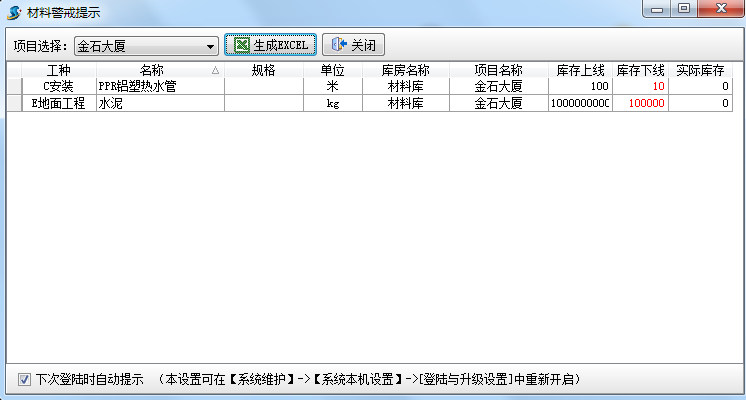 在工程項(xiàng)目管理系統(tǒng)中我們也可以設(shè)置登錄軟件時(shí)自動(dòng)提示庫(kù)存警戒。設(shè)置好之后當(dāng)材料的庫(kù)存量達(dá)到了預(yù)警設(shè)置中設(shè)置的上限或者下限,登錄時(shí)會(huì)自動(dòng)彈出提示。