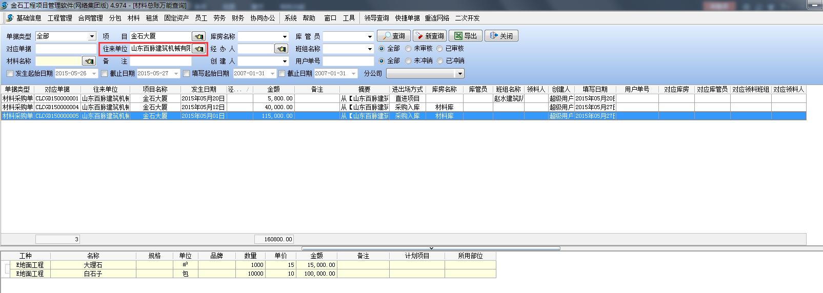 如下圖:查詢往來(lái)單位【山東百脈建筑機(jī)械有限公司】發(fā)生的所有材料的歷史記錄(與外單位發(fā)生的單據(jù)一般只有【材料采購(gòu)單】、【材料退貨單】、【材料銷(xiāo)售單】)。