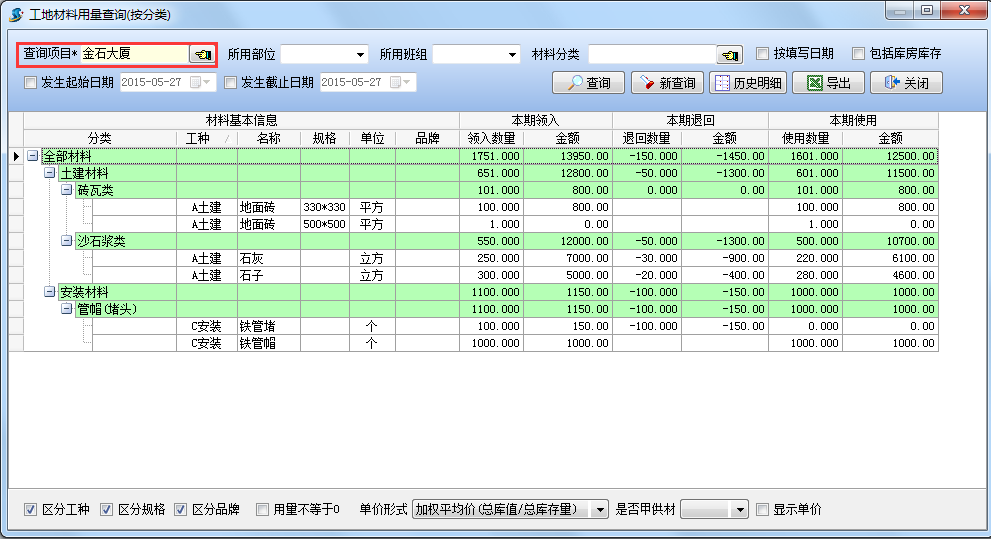 在工程項(xiàng)目管理系統(tǒng)中【工地材料用量查詢(按分類(lèi))】是按材料分類(lèi)分類(lèi)查詢工地材料用量,在查詢前需要設(shè)置查詢項(xiàng)目。設(shè)置查詢項(xiàng)目為【金石大廈】,查詢結(jié)果如下圖: