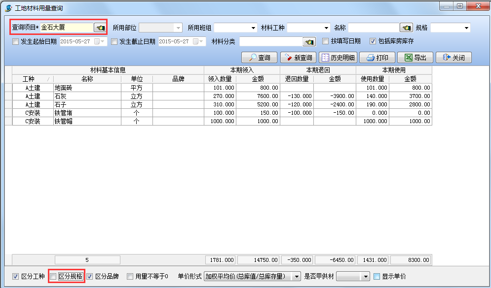 取消過(guò)濾選項(xiàng)"區(qū)分規(guī)格",查詢結(jié)果如下圖:相同材料不同規(guī)格的材料用量將匯總在一起。