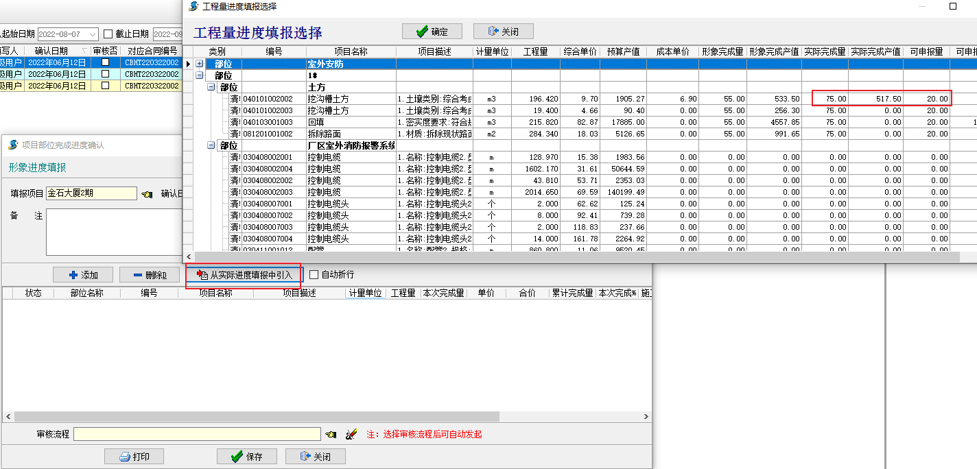 若選擇形象進(jìn)度時(shí),可以選擇從實(shí)際進(jìn)度填報(bào)中引入,選擇已經(jīng)發(fā)生實(shí)際填報(bào)的清單,雙擊調(diào)入過來,然后依次對本次完成量或完成百分比進(jìn)行輸入,此時(shí)的單價(jià)為【部分分解及工程量清單】中的綜合單價(jià),本步驟完成后,可以看到當(dāng)前進(jìn)度填報(bào)的產(chǎn)值,接下來可以打印或者導(dǎo)出,為甲方申報(bào)進(jìn)度款使用。