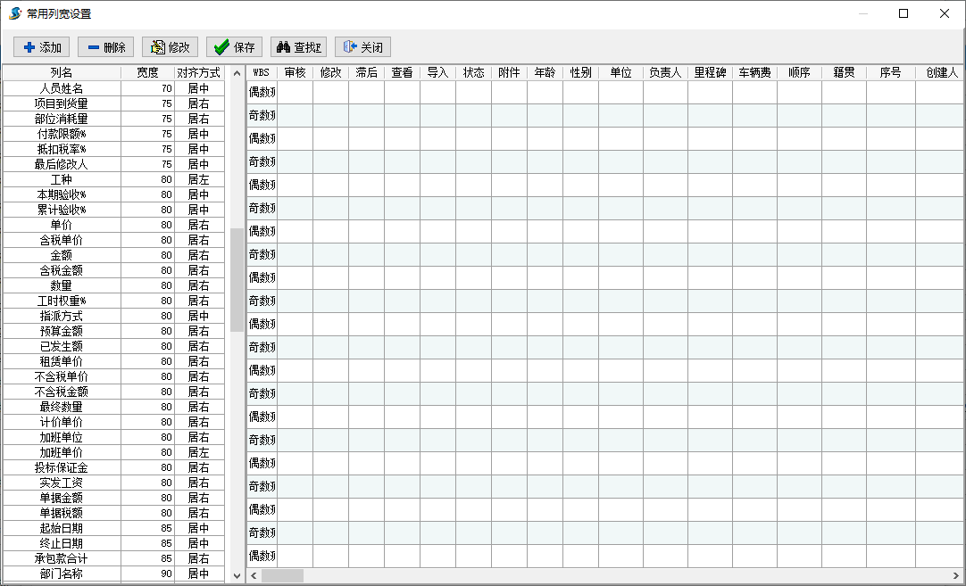 對(duì)單據(jù)表格中不同字段的列寬做單獨(dú)設(shè)置,分字段名、寬度和對(duì)齊方式3種設(shè)置,字段名必須與列表或查詢表格中的字段名一致,否則無(wú)法生效;寬度為字段的顯示寬度,原則為恰好或更好顯示當(dāng)前字段內(nèi)容為準(zhǔn);對(duì)齊方式分居中、居左和居右3種方式,原則上推薦數(shù)字類居右顯示,其他字段可根據(jù)用戶個(gè)體習(xí)慣自行設(shè)置,設(shè)置界面圖如下: