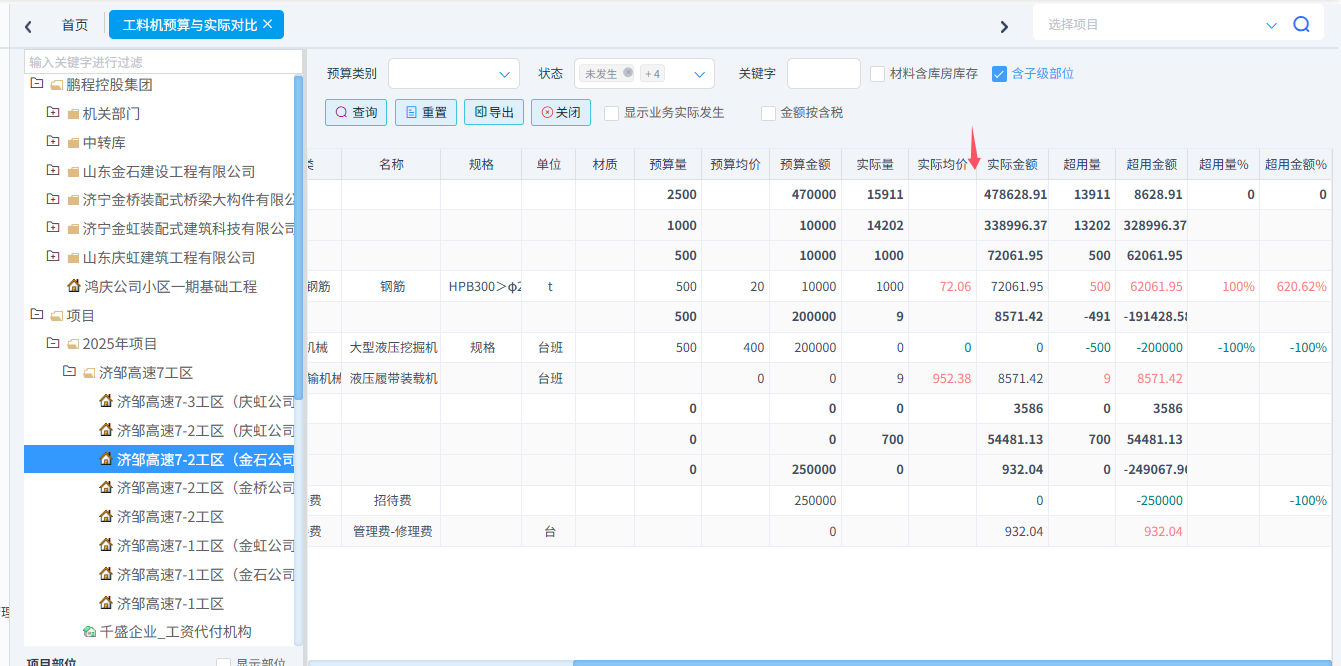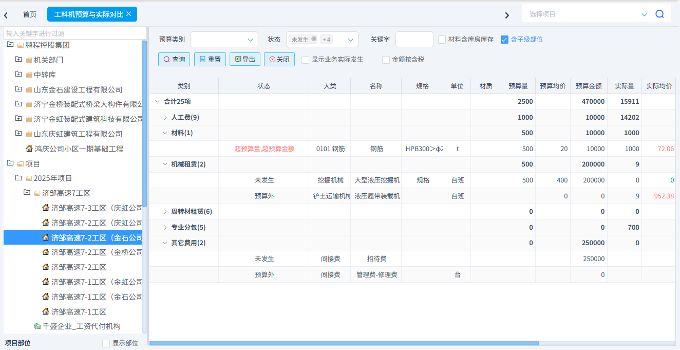 可以統計工料機預算與實際對比、合同清單與實際發生對比、分部分項四算對比