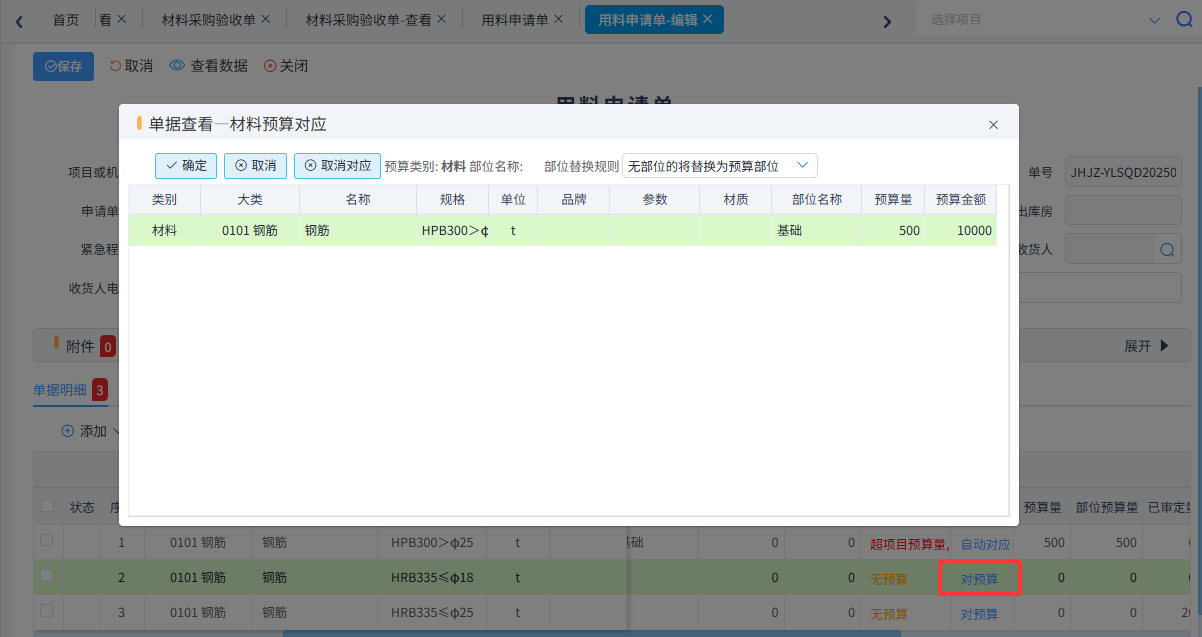 如果單據填寫時或者以后查詢預算對比時發現預算材料跟實際發生不一致,可以選擇手動對應預算