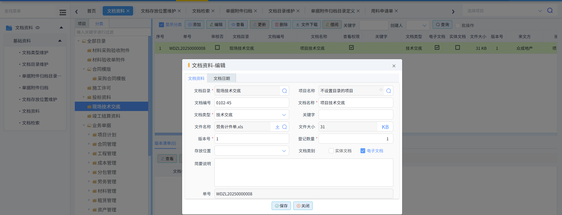 常用文檔資料的類型,比如投標資料、中標通知書、開工資料等,如下圖