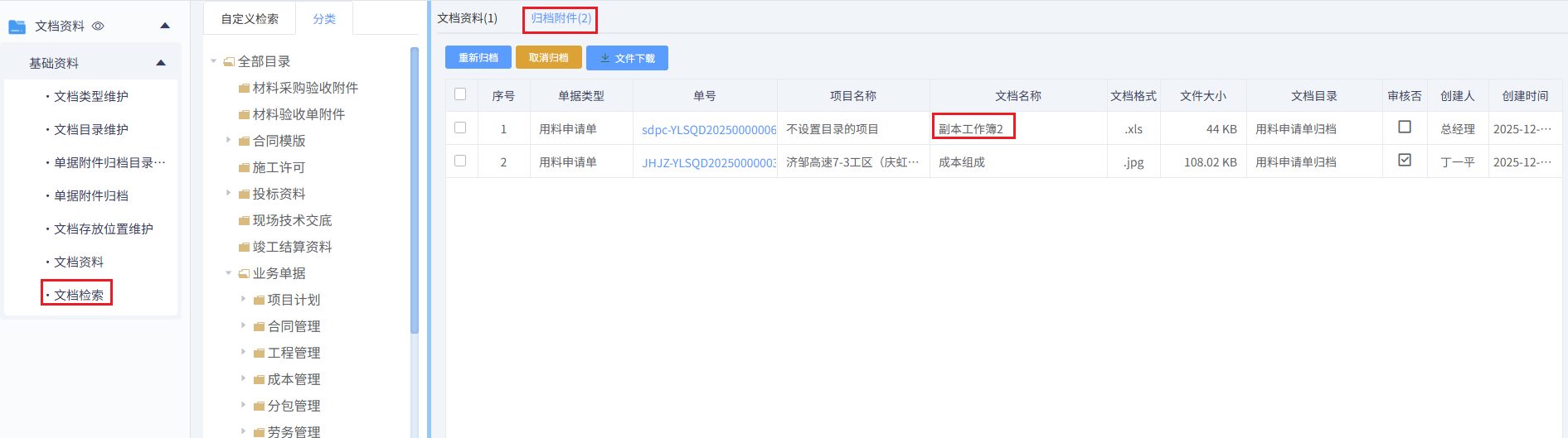 文檔檢索,用于查詢、查看和下載文檔資料上傳和單據附件歸檔后的資料文件,