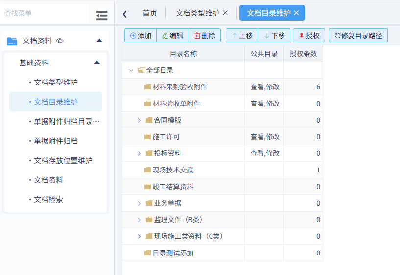 常見文檔資料的目錄需要提前維護好,以便后期資料上傳時選擇。如下圖