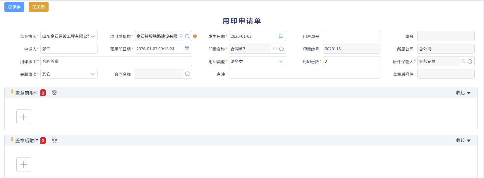 當用章人要申請使用印章時,做用印申請單,選擇印章執(zhí)照,所用項目或機構(gòu),申請人,用印日期,用印理由,用印份數(shù)等,如下提所示