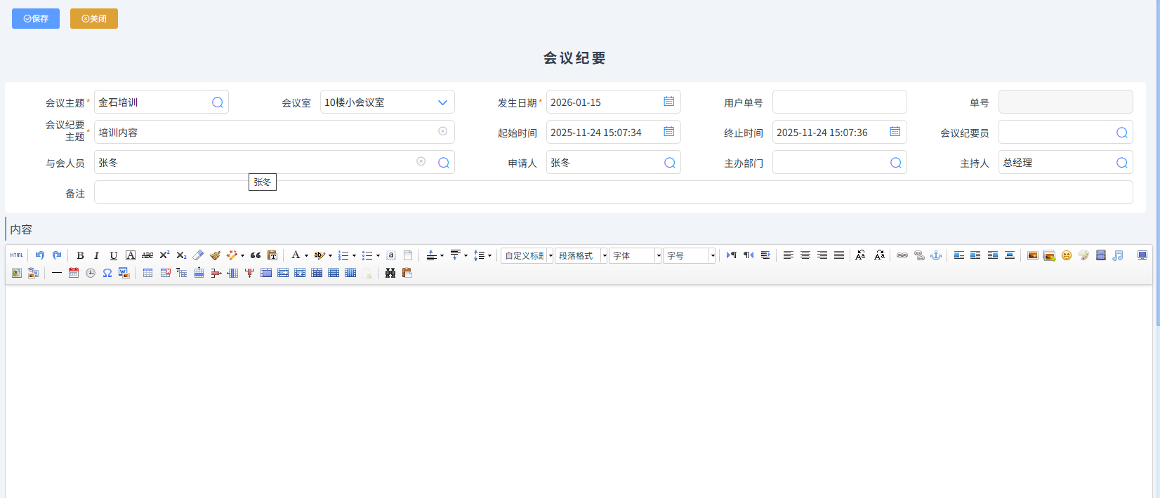 會(huì)議紀(jì)要員根據(jù)會(huì)議內(nèi)容,記錄會(huì)議紀(jì)要,整理完畢后,做會(huì)議紀(jì)要登記,如下圖所示,內(nèi)容部分,可以復(fù)制黏貼整理好的內(nèi)容,還可以添加圖片,調(diào)整字體、段落格式等,