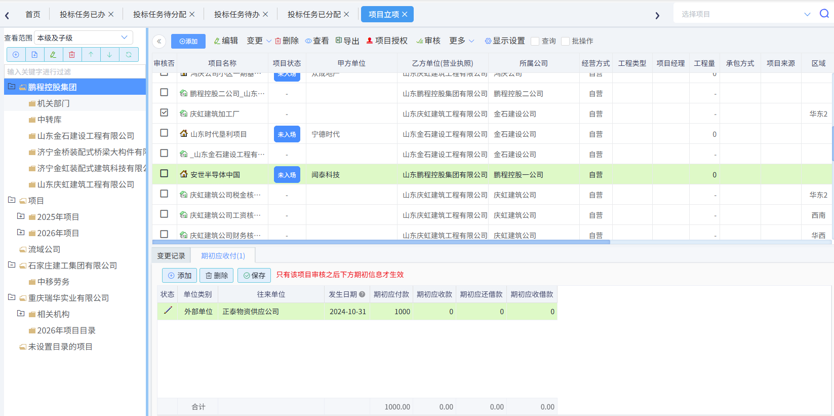 項目立項即生產立項,項目中標后在此界面建立項目,左側為樹狀結構項目節點,右側上方為常用按鈕和查詢區域,下方為項目的基本信息,如下圖所示: