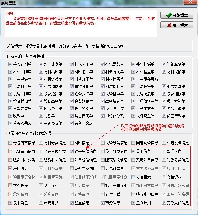 在彈出的窗口中選擇需要清除的內容(例:業務單據、項目維護、材料工種等),
