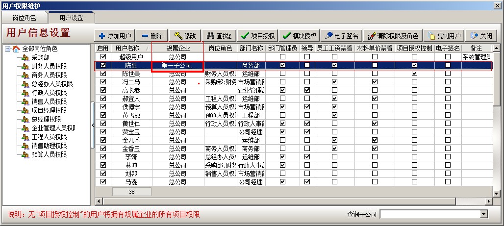 二、 項目按個人授權 (注:適合普通企業(yè) 或 集團公司下的分公司) 1、 以剛才陳勝為例,只讓他看到金石國際大廈 項目 (配合上面的項目按分公司授權,這樣就可以實現集團公司的項目二級授權)具體操作:登錄超級用戶---系統(tǒng)維護---打開用戶管理權限設置,選擇員工陳勝,點項目授權,開啟項目授權控制,在金石國際大廈這個項目前面打鉤