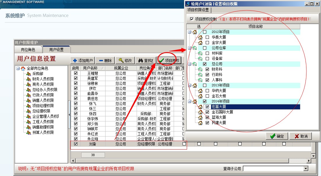 登錄超級用戶---系統(tǒng)維護---用戶管理權限設置,選中劉備,點項目授權,設置劉備有部分項目權限,如下圖